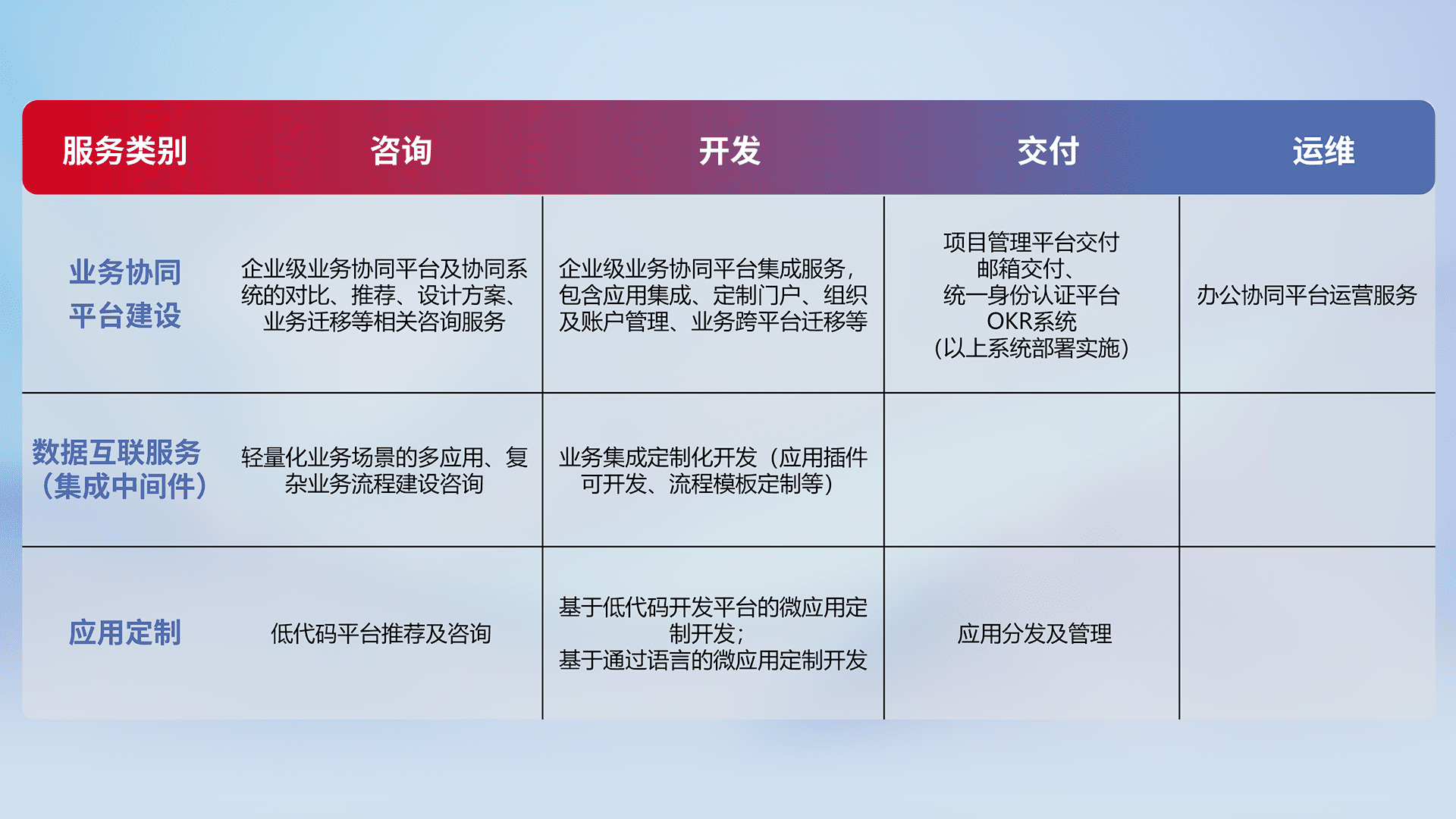 针对钉钉、、、、企微、、、、IDaas等平台级产品提供产品的规划、、方案、、交付、、、、定制化开发等服务,,实现如统一协同办公、、智能客户服务、、、混合会议管理、、、、智能数据查询、、、等业务场景,,,实现数字化转型。。