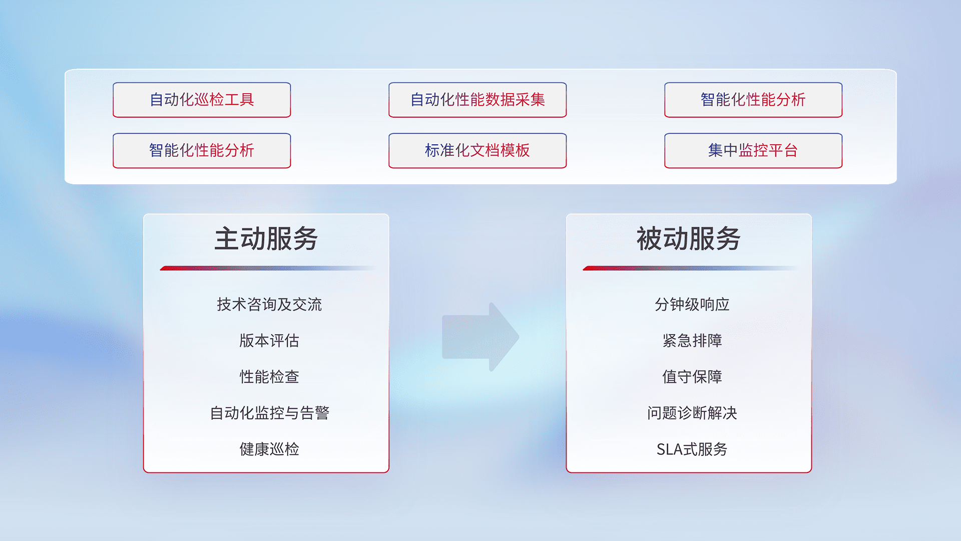 智能化工具和标准化文档,,,保障服务质量,,,,提供主动服务(包含技术咨询、、、版本评估、、、性能检查、、、自动化监控与告警、、、健康巡检)和被动服务包含(分钟级响应、、、紧急排障、、、、值守保障、、问题诊断解决、、、、SLA服务)。。
