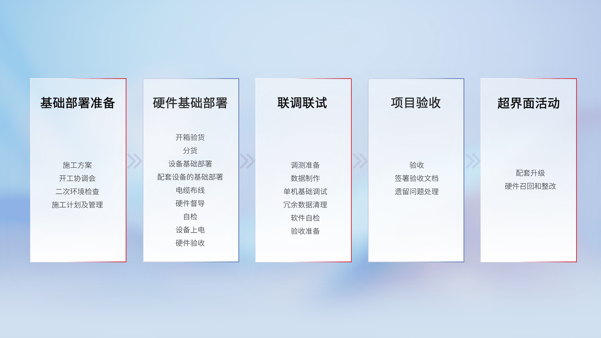 从基础部署准备、、、、硬件基础部署、、、、联调联试、、项目验收、、越界面活动的全过程可追溯,,,保证施工质量和进度。。